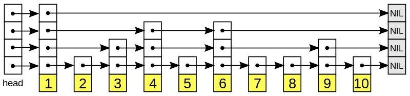 通过使用SkipList,我们构建了多个List,包含不同的排序过的节点,从而提升List的查找效率。