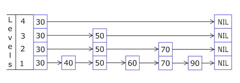 SkipList是一种层级结构。最底层的是排序过的最原始的linked list。