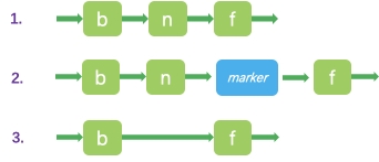 第三步,使用CAS将b的next指针指向f。从这一步起,n节点不会再被其他的程序访问,这意味着n可以被垃圾回收了。