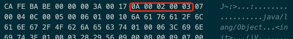 首先第一个字节是常量的tag, 0A=10,对比一下上面的表格,10表示的是CONSTANT_Methodref方法引用。