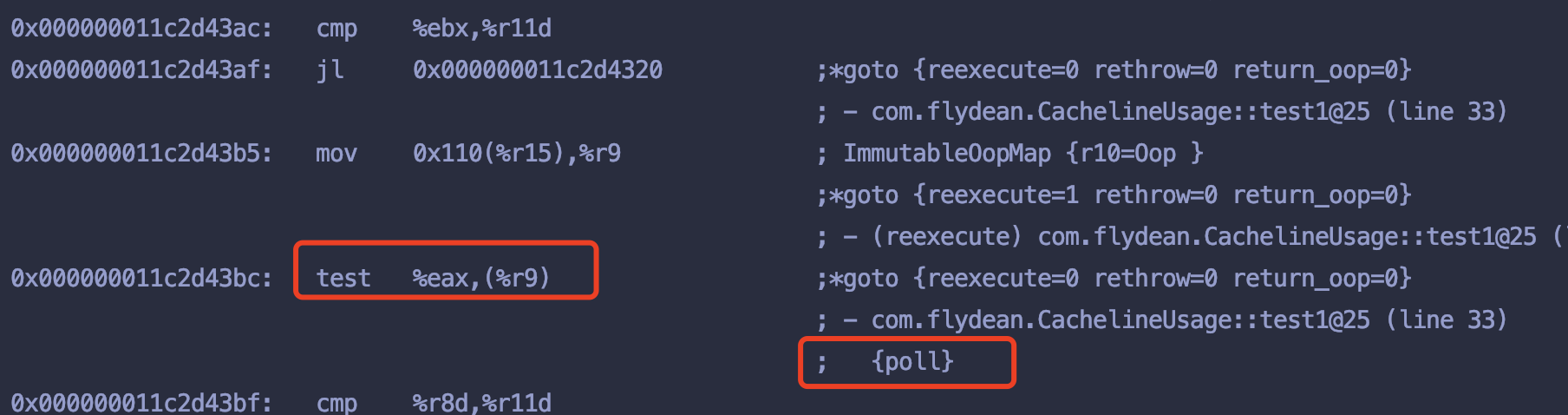 可以看到其中有个test的指令,这个test指令就是生成的safe points。