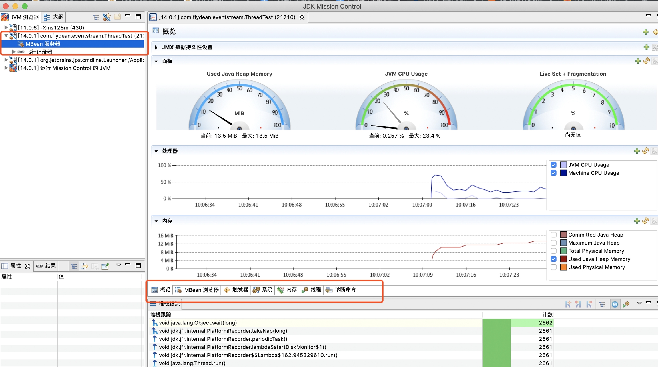 点击MBean服务器,可以看到该java程序的面板信息,里面包含CPU,堆栈信息。