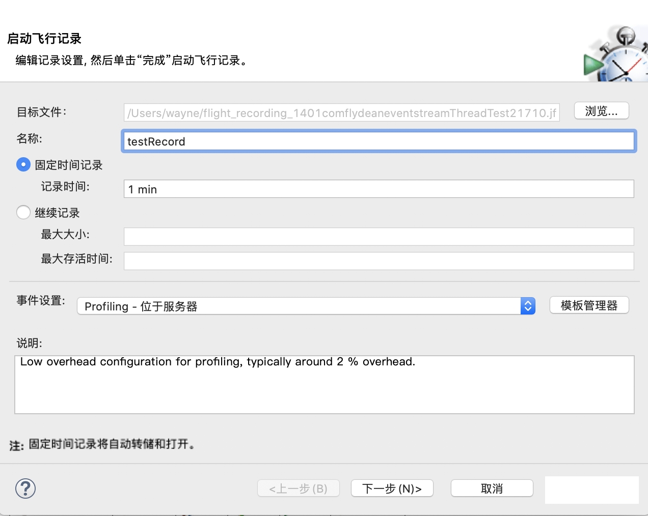 目标文件就是JFR的生成地址,名称可以自己随便起一个,记录时间表示需要记录多长时间范围之内的JFR。