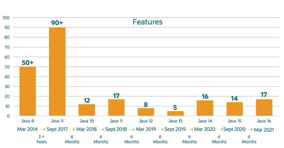 下面图是JDK从8开始到16的新特性个数: