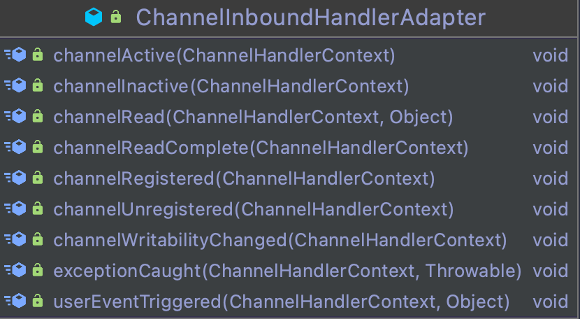 如上图所示,channel上可以出现很多事件,比如建立连接,关闭连接,读取数据,读取完成,注册,取消注册等。这些方法都是可以被重写的,我们只需要新建一个类,继承ChannelInboundHandlerAdapter即可。