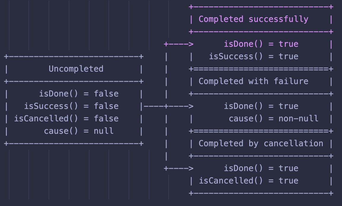 当一个IO刚开始的时候,返回一个ChannelFuture对象,这个对象的初始状态是uncompleted。注意,这个状态下的IO是还未开始工作的状态。当IO完成之后,不管是succeeded, failed 或者 cancelled状态,ChannelFuture的状态都会转换成为completed。