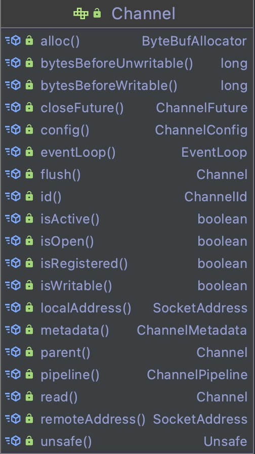 public interface Channel extends AttributeMap, ChannelOutboundInvoker, Comparable<Channel> {可以看到Channel是一个接口,它继承了AttributeMap, ChannelOutboundInvoker, Comparable三个类。Comparable表示这个类可以用来做比较。AttributeMap用来存储Channel的各种属性。ChannelOutboundInvoker主要负责Channel和外部 SocketAddress 进行连接和对写。