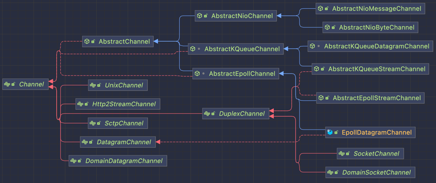 DuplexChannel的是实现有很多种,比如常见的NIOSocketChannel,KQueueSocketChannel,EpollSocketChannel等。