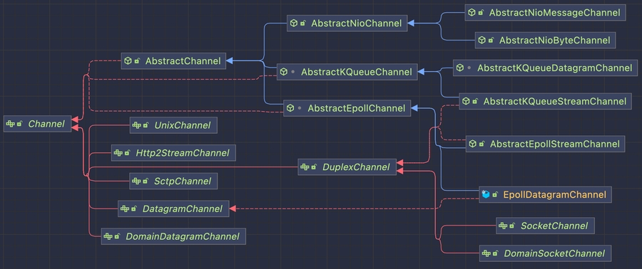 另外一个channel的非常重要的子类就是AbstractChannel,AbstractChannel有三个非常重要的实现,分别是AbstractNioChannel,AbstractKQueueChannel和AbstractEpollChannel。