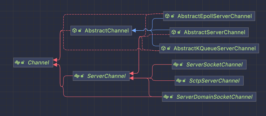 从上图我们可以看出,ServerChannel有六个抽象类实现,分别是AbstractEpollServerChannel,AbstractKQueueServerChannel,AbstractServerChannel,ServerSocketChannel,SctpServerChannel和ServerDomainSocketChannel。