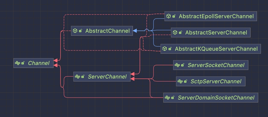 但是因为ServerChannel继承自Channel,所以相对的ServerChannel的分类和实现要比Channel要少。所以我们先以ServerChannel为例进行讲解。
