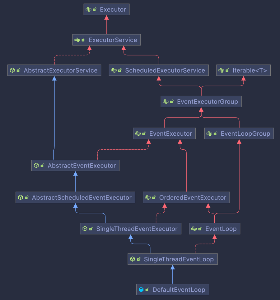 DefaultEventLoop继承自SingleThreadEventLoop,而SingleThreadEventLoop又继承自SingleThreadEventExecutor并且实现了EventLoop接口。