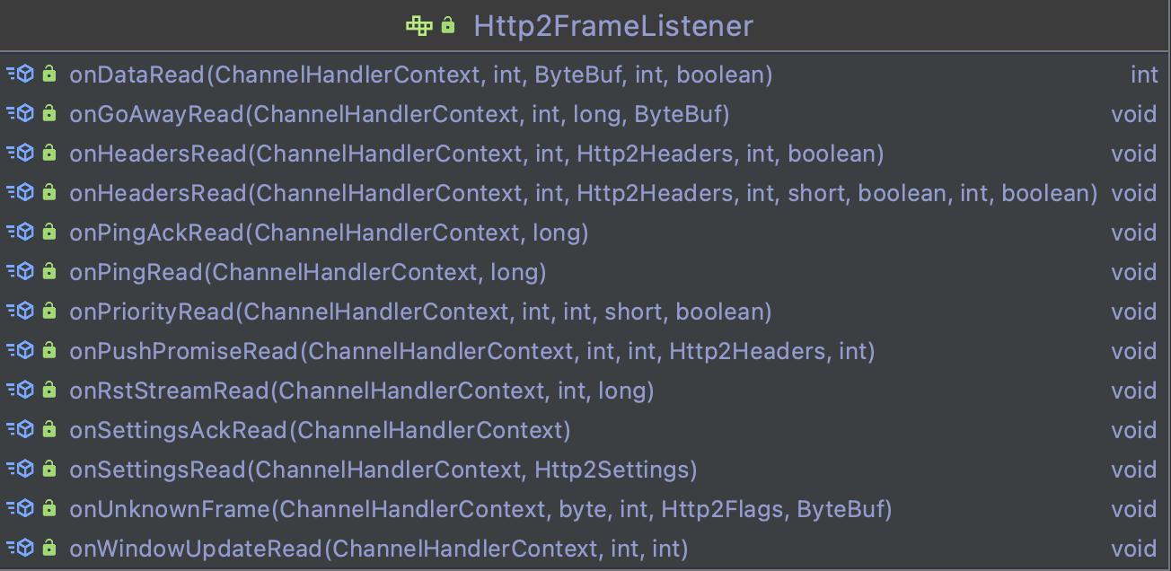 Http2ConnectionHandler是一个实现类,它已经实现了处理各种inbound frame events的事件,然后将这些事件委托给 Http2FrameListener。
