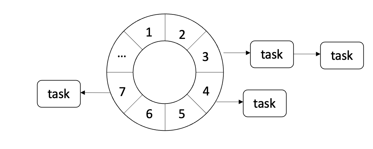 我们知道Hash可以实现高效的O(1)查找,想象一下假如我们有一个无限刻度的钟表,然后把要执行的任务按照间隔时间长短的顺序分配到这些刻度中,每当钟表移动一个刻度,即可以执行这个刻度中对应的任务,如下图所示: