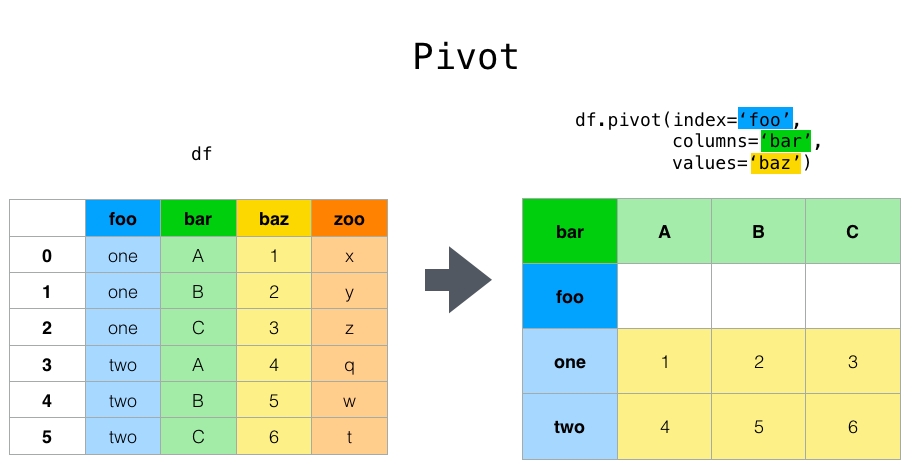 通过pivot变化,新的DF使用foo中的值作为index,使用bar的值作为columns,zoo作为对应的value。