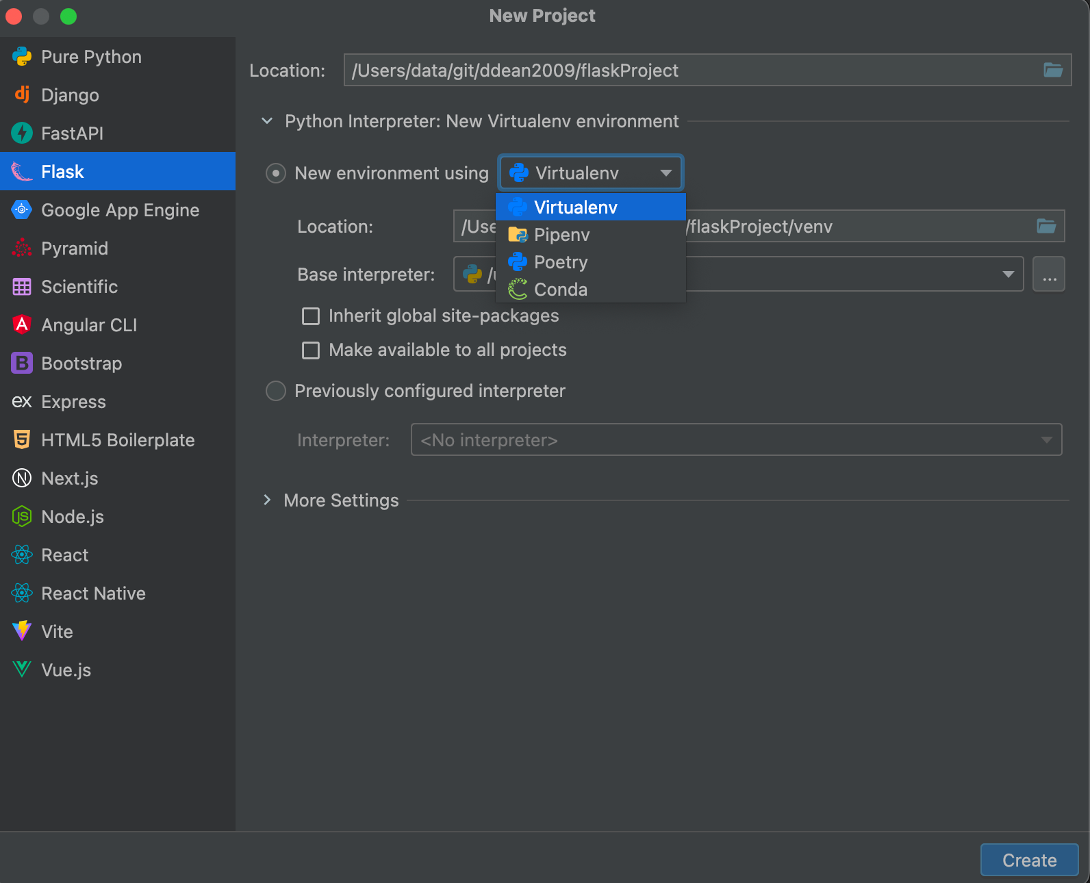 使用venv非常简单,如果你用的开发工具是pycharm,那么在创建python的flask项目的时候,会自动选择对应的虚拟环境创建工具,这里我们选择使用venv即可自动创建。