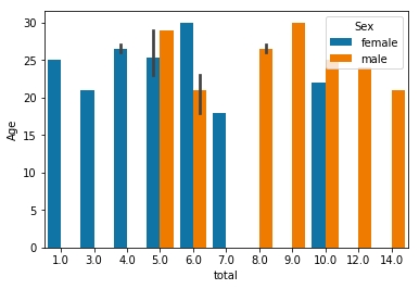 sns.barplot(x='total', y='Age', hue='Sex', data=stack_subset)