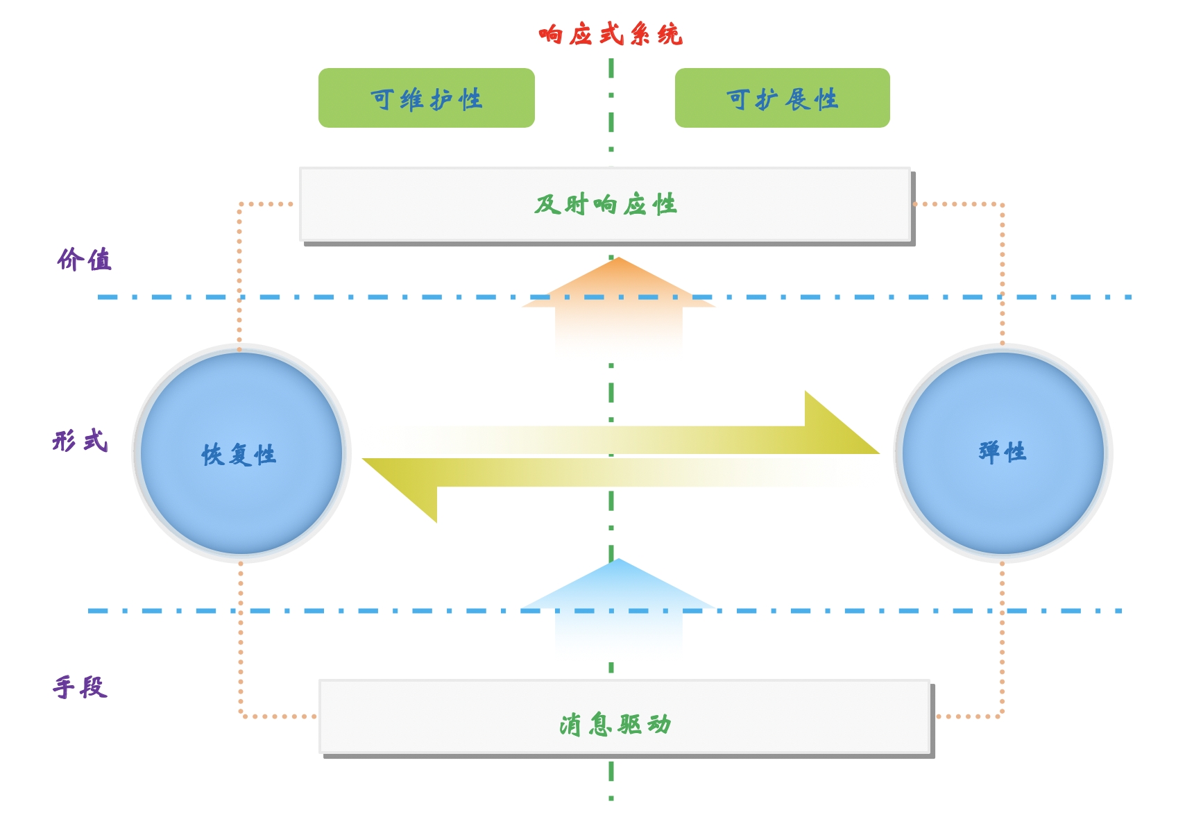 上面的四个特性中,及时响应性(Responsive)是系统最终要达到的目标,恢复性(Resilient)和有弹性(Elastic)是系统的表现形式,而消息驱动(Message Driven)则是系统构建的手段。