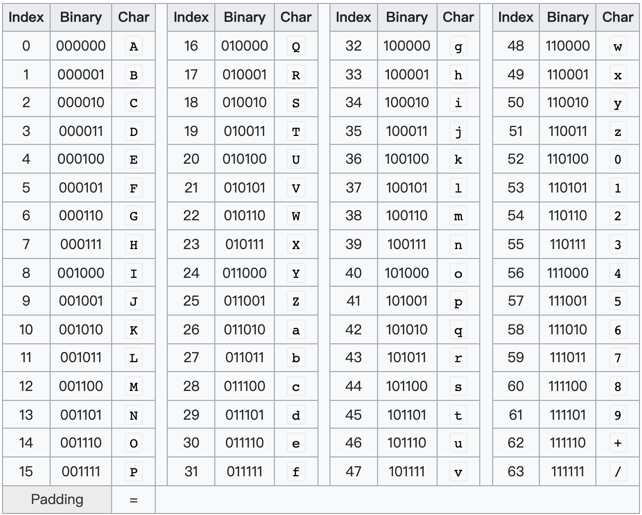 base64的原理是通过一个映射表,将二进制编码映射成为64个字符(26个小写字母+26个大写字母+10个数字+加号和斜杠)。