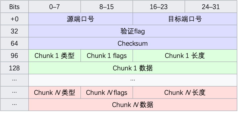 packet后面跟着就是Chunks,一个chunk表示一个数据块,每个chunk都有共同的结构,分别是Chunk type,Chunk flags,Chunk length和Chunk data组成。