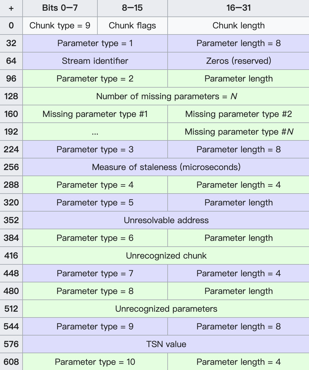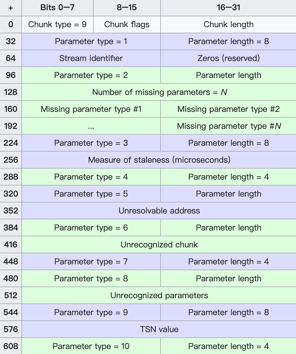 Parameter type = 9: 表示DATA chunk中不包含任何用户数据,通常和ABORT chunk一起使用。