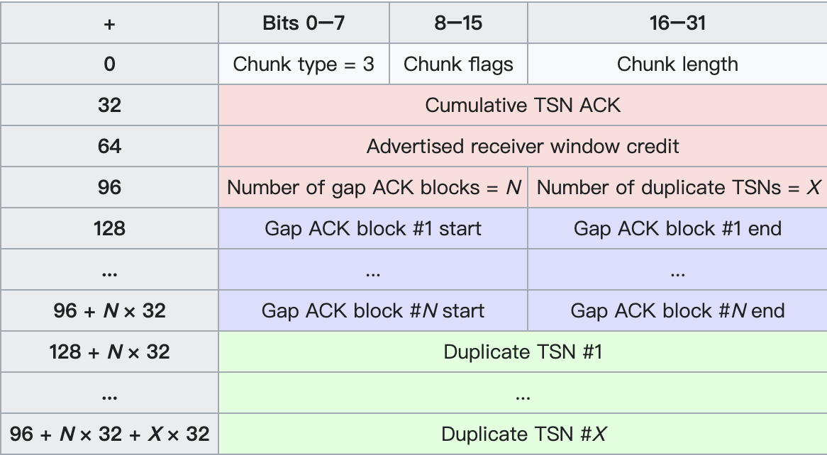 最后,SACK可能接收多个TSN,所以这里有个重复TSN的概念,这里叫做Duplicate TSN #X。