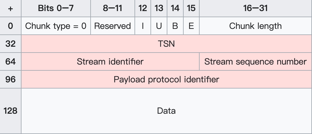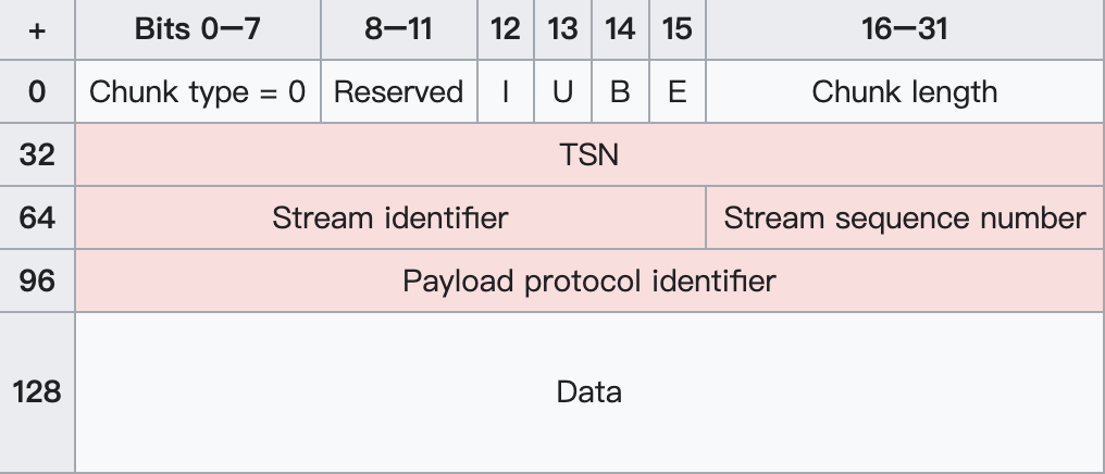I — 表示应该立刻返回SACK chunk。 U - 如果设置,表示这个数据是无序的,那么后面的流序列号是无效的。 B - 如果设置,表示的是beginning fragment。 E - 如果设置,表示的是end fragment。