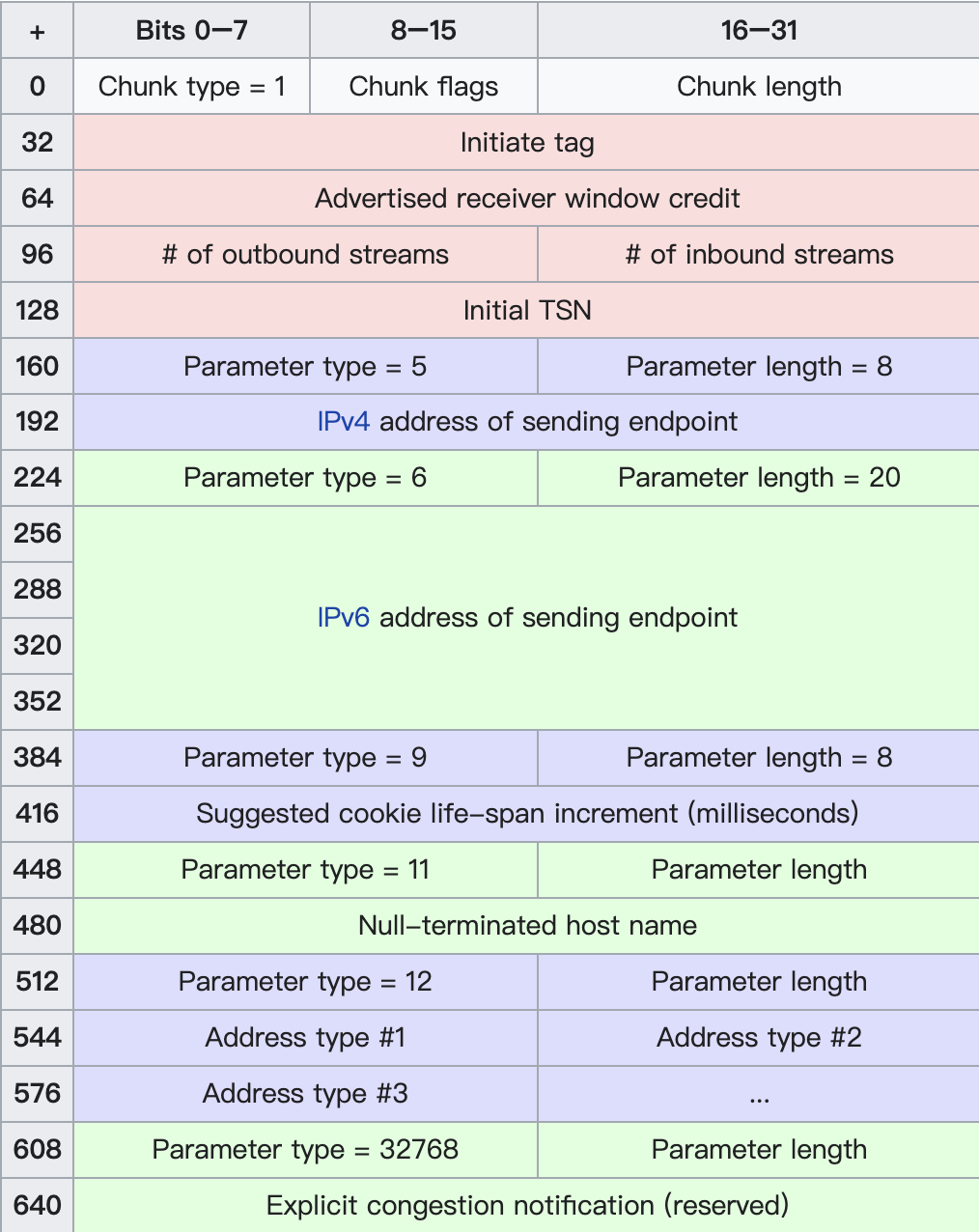 INIT chunk是初始化请求的chunk,它的chunk type=1,我来看下他的具体格式定义: