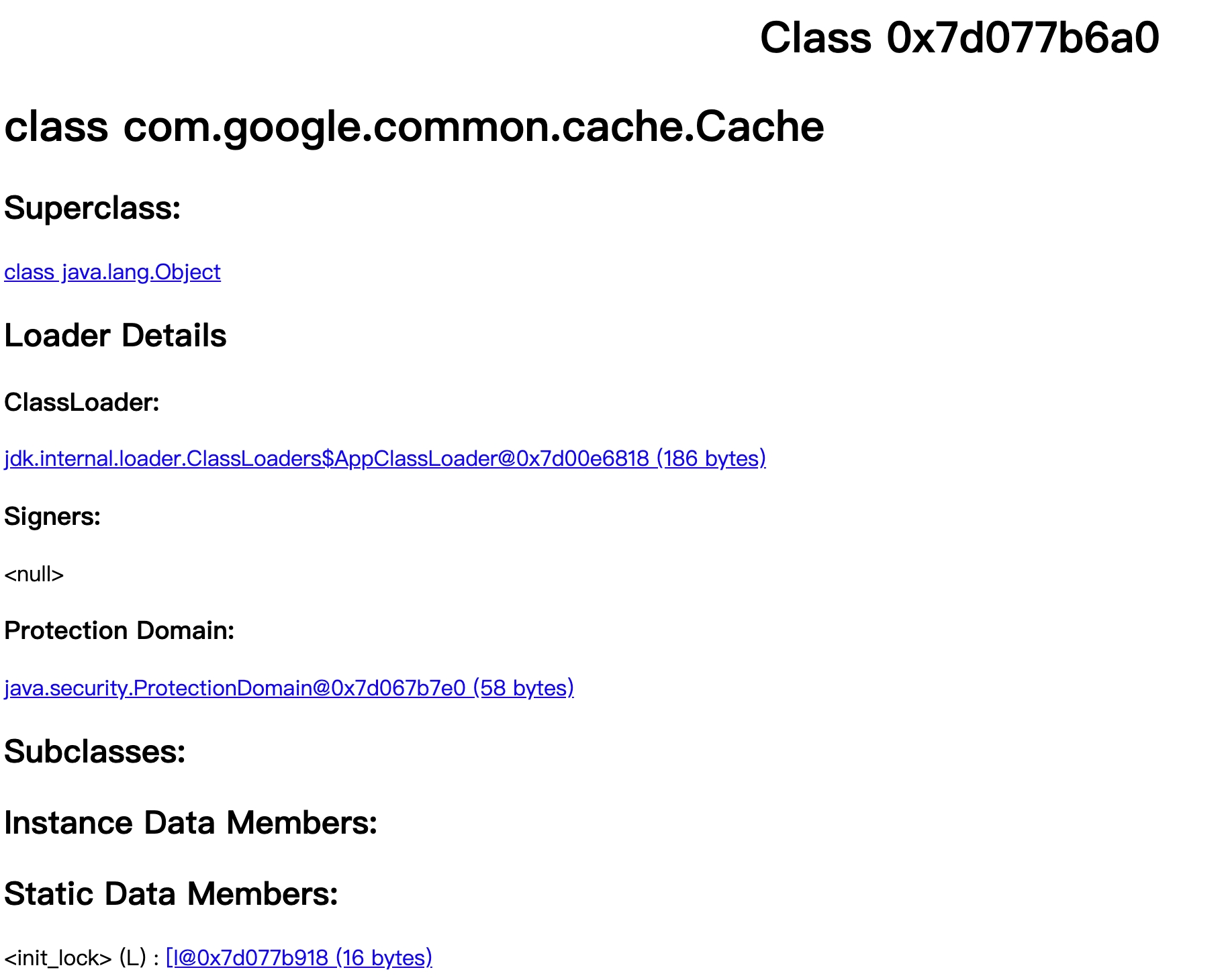 类的信息页面包含很多信息,包括父类,类加载器,签名,安全域,子类,实例,引用等详细信息。