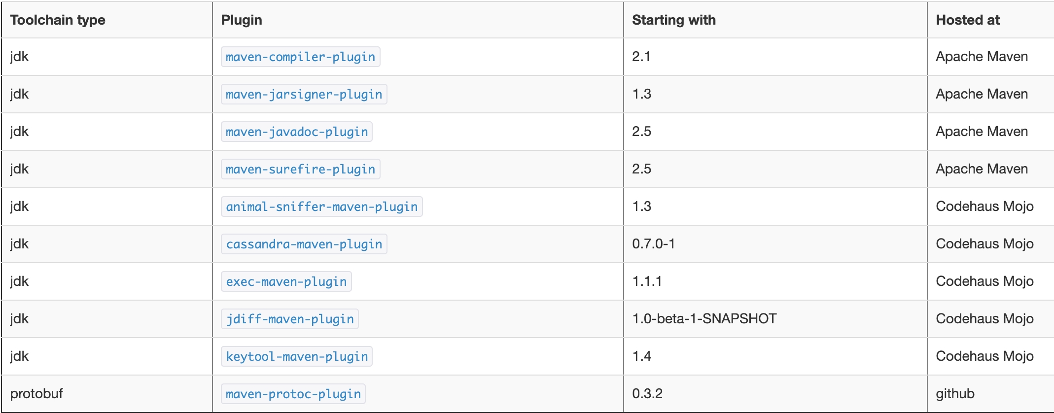 Toolchains是需要和pom中的plugin一起使用的,下面的图中列出了toolchains支持的plugin名字和最低的版本要求。