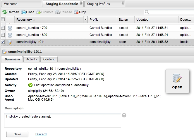 选择staging存储库,列表下方的面板将显示有关存储库的更多详细信息。 另外,可以点击Close和Release按钮。