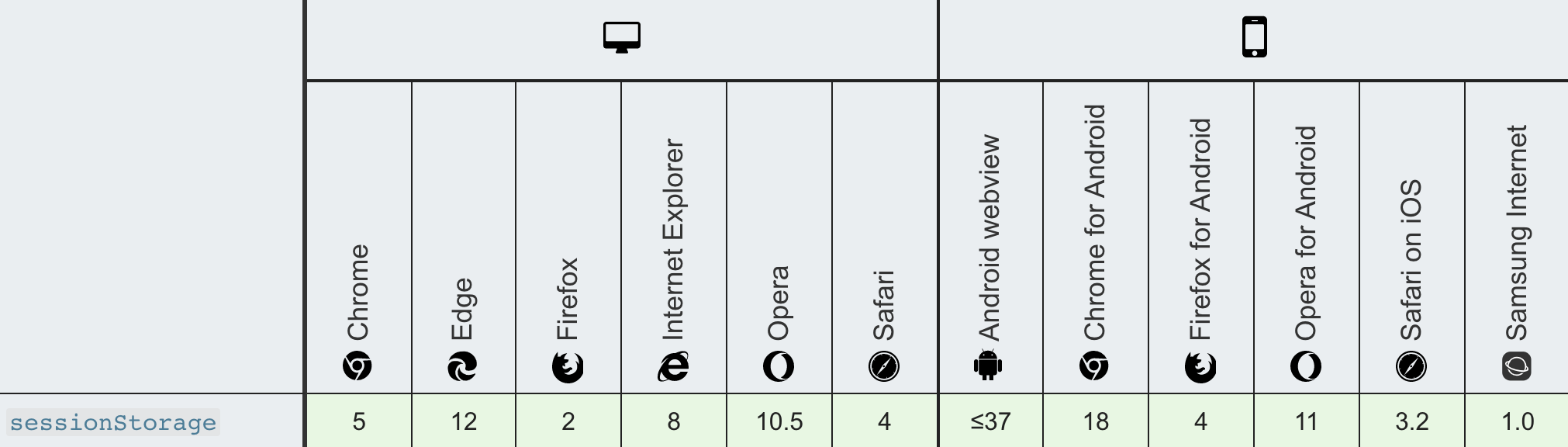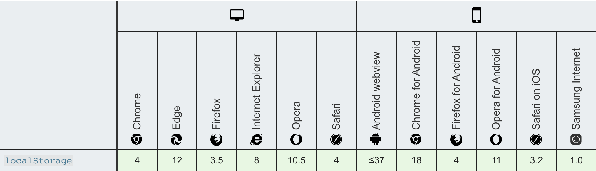 我们用两张图来看一下这两个storage在不同浏览器的兼容性: